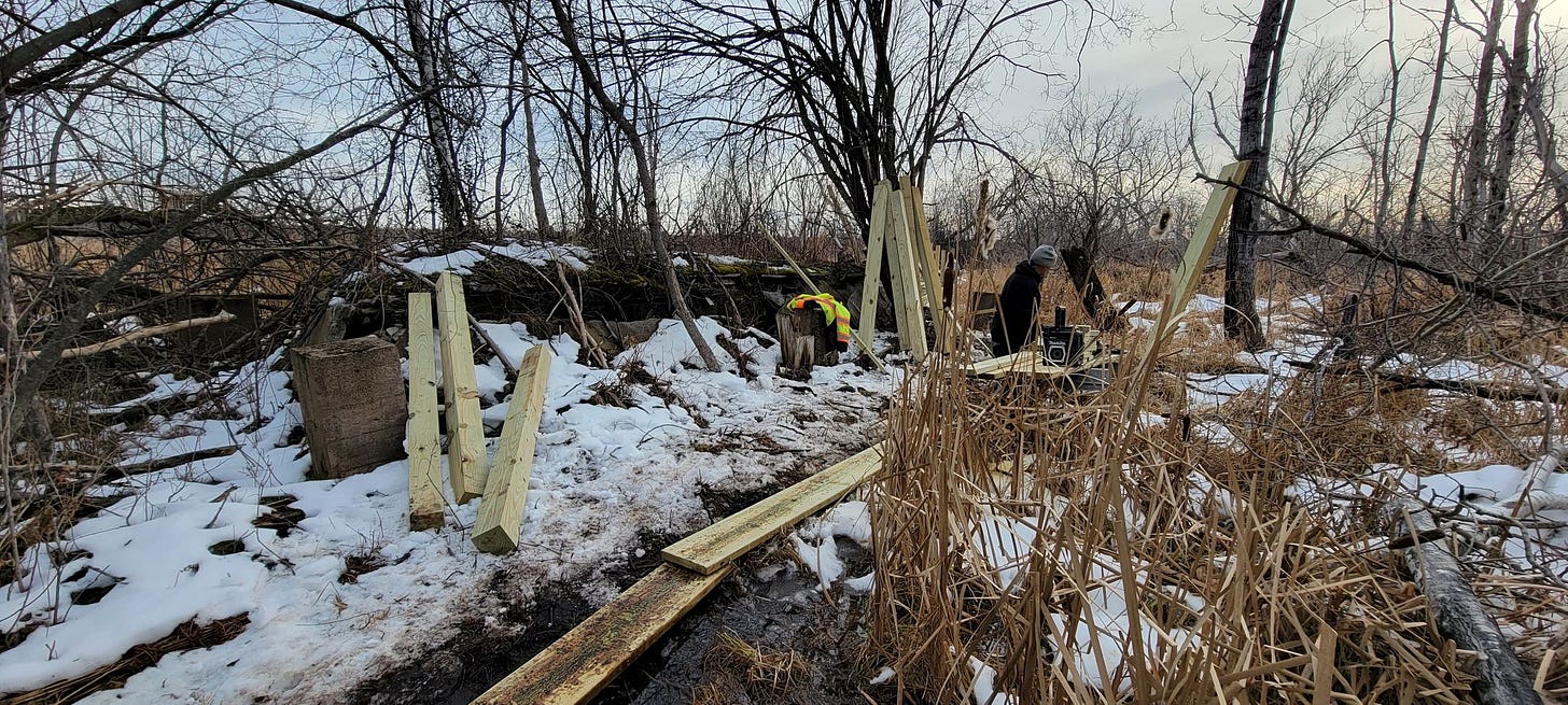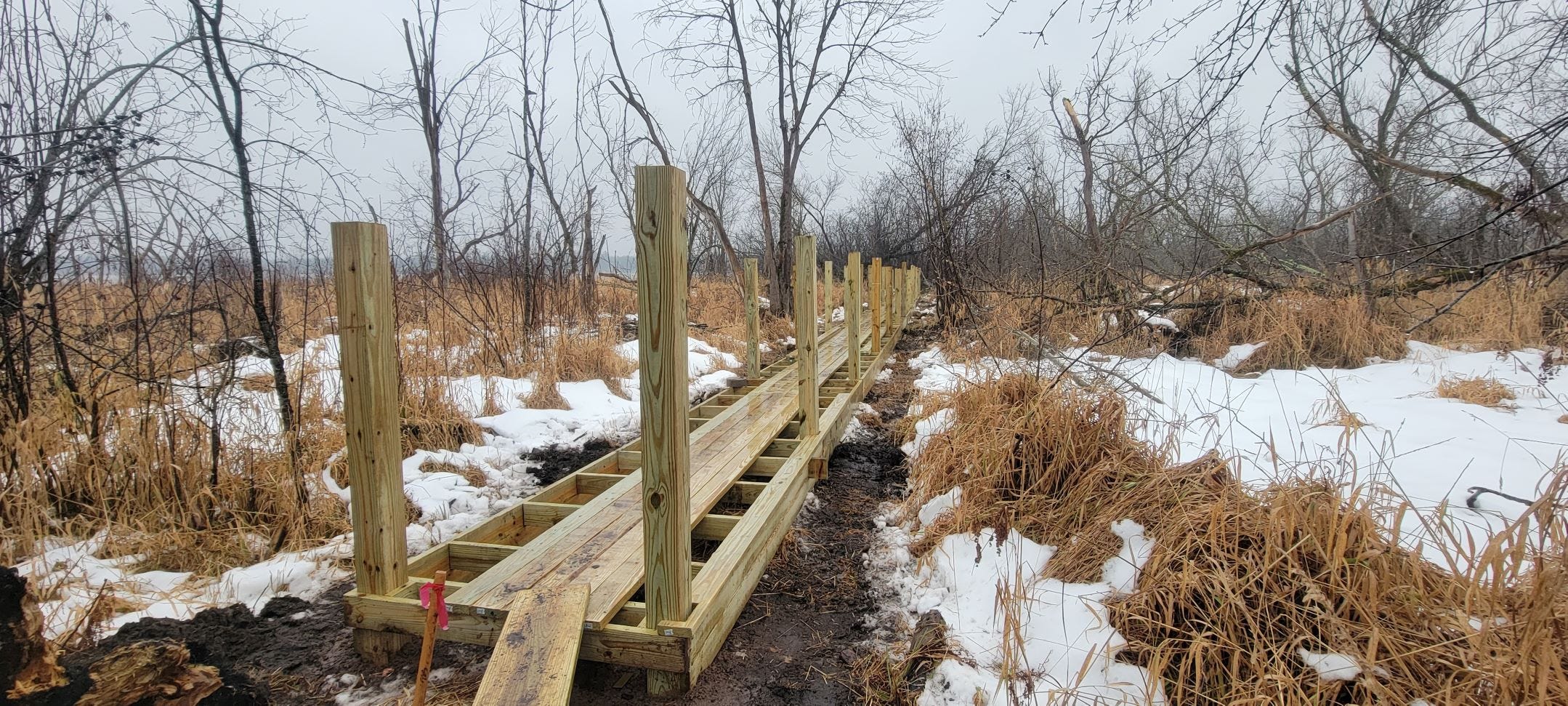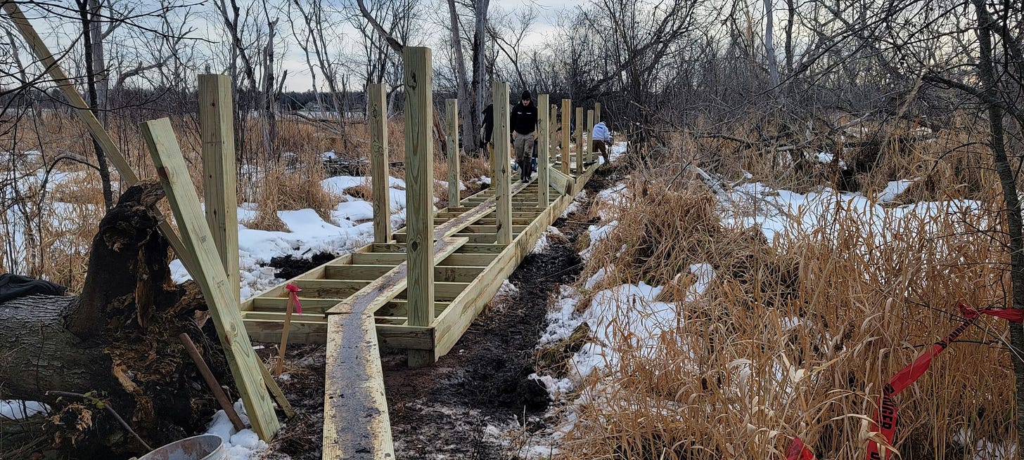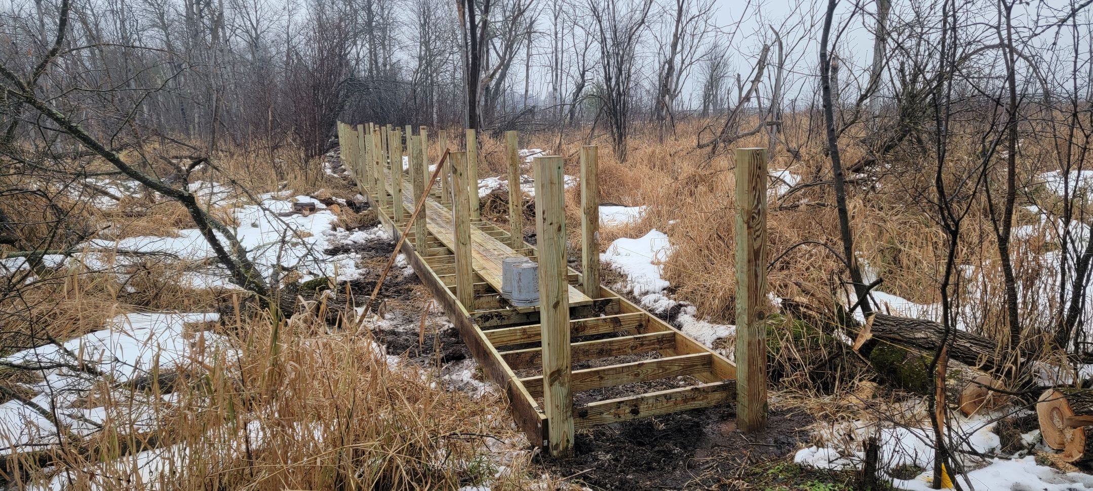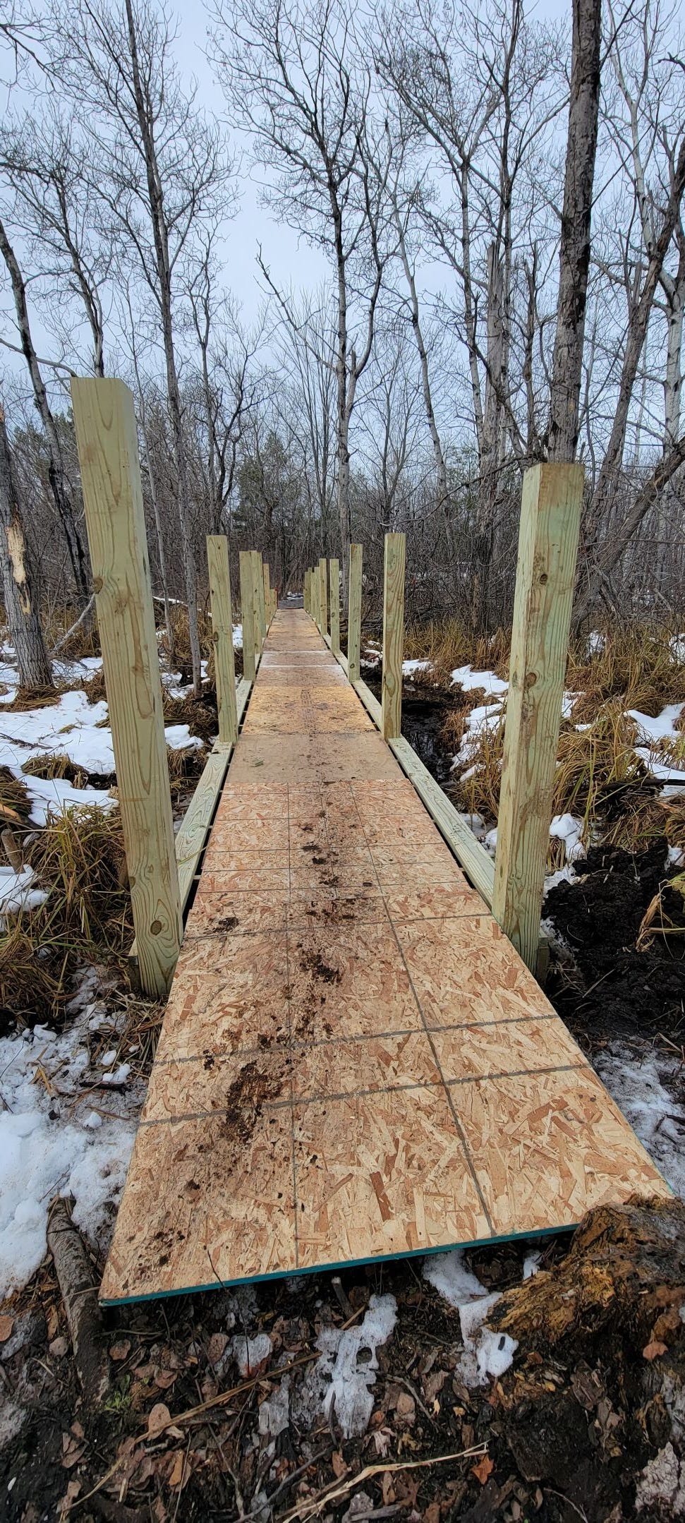 DP Construction continued its work on the historic interpretive trail boardwalk with the structural span from the planing mill reaching the former site of the offices.