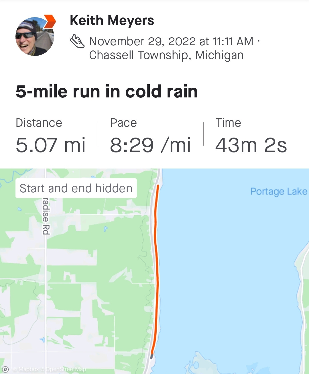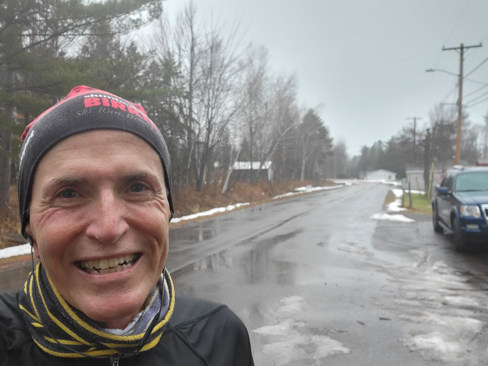 The weather forecast for Wednesday evening was looking less than desirable for a run (snow with strong wind) so I headed out for a run on the rail-trail around lunch time on Tuesday. A cold rain started to fall along the way and I was soaking wet by the time I returned home.