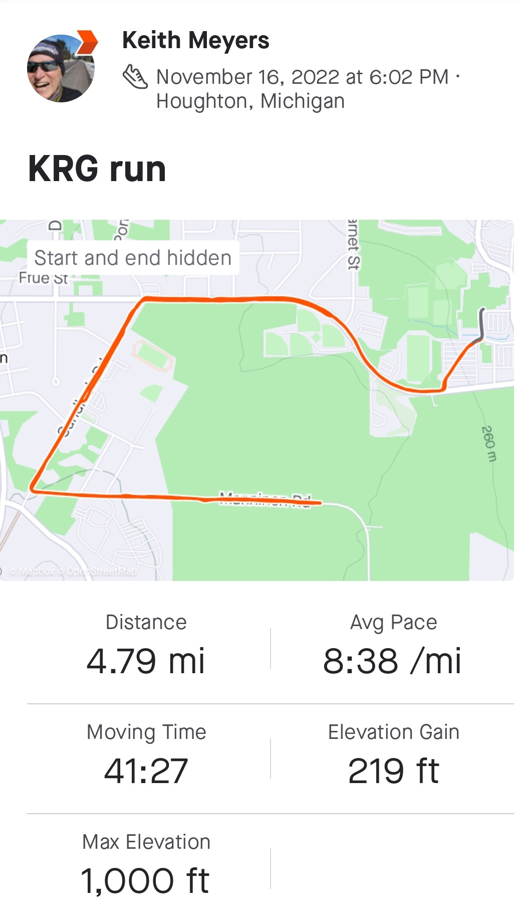 Wednesday, November 16th, was my first snow covered road run of the season with the Keweenaw Running Group. The spikes were definitely in order as we headed up Sharon on snowpacked sidewalks then down Gundlach and out on Pilgrim Road. As much as I enjoy being out on the trails the rest of the year, I have to say that I have a bias toward roads from a consistent pace standpoint.